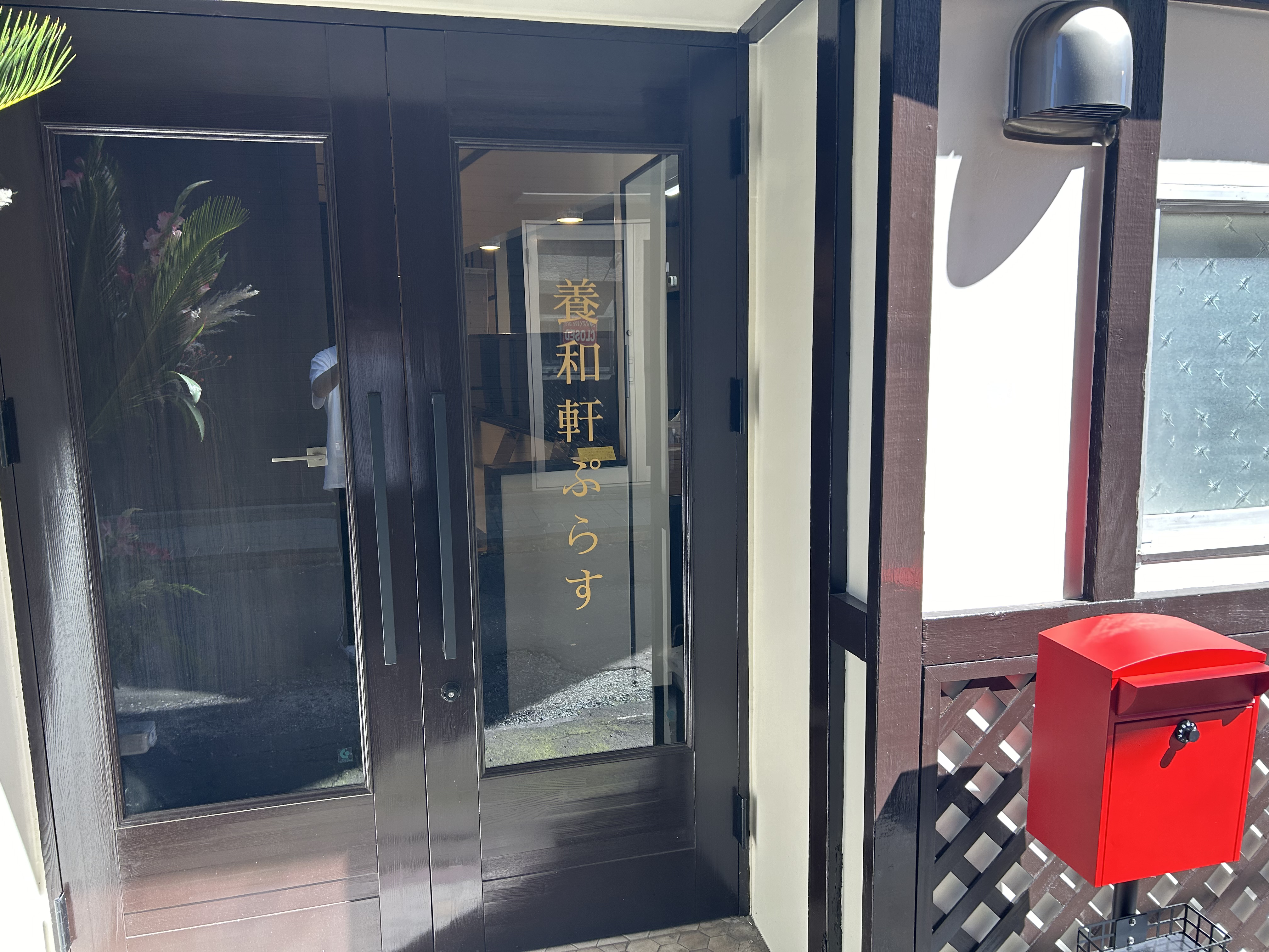 「養和軒ぷらす」の入口は、一見すると控えめでありながら、しっかりと存在感を放っています。落ち着いたダークブラウンの木製ドアに、金色で刻まれた店名。シンプルながらも凛とした佇まいは、通りを歩く人の目を自然と引き寄せます。